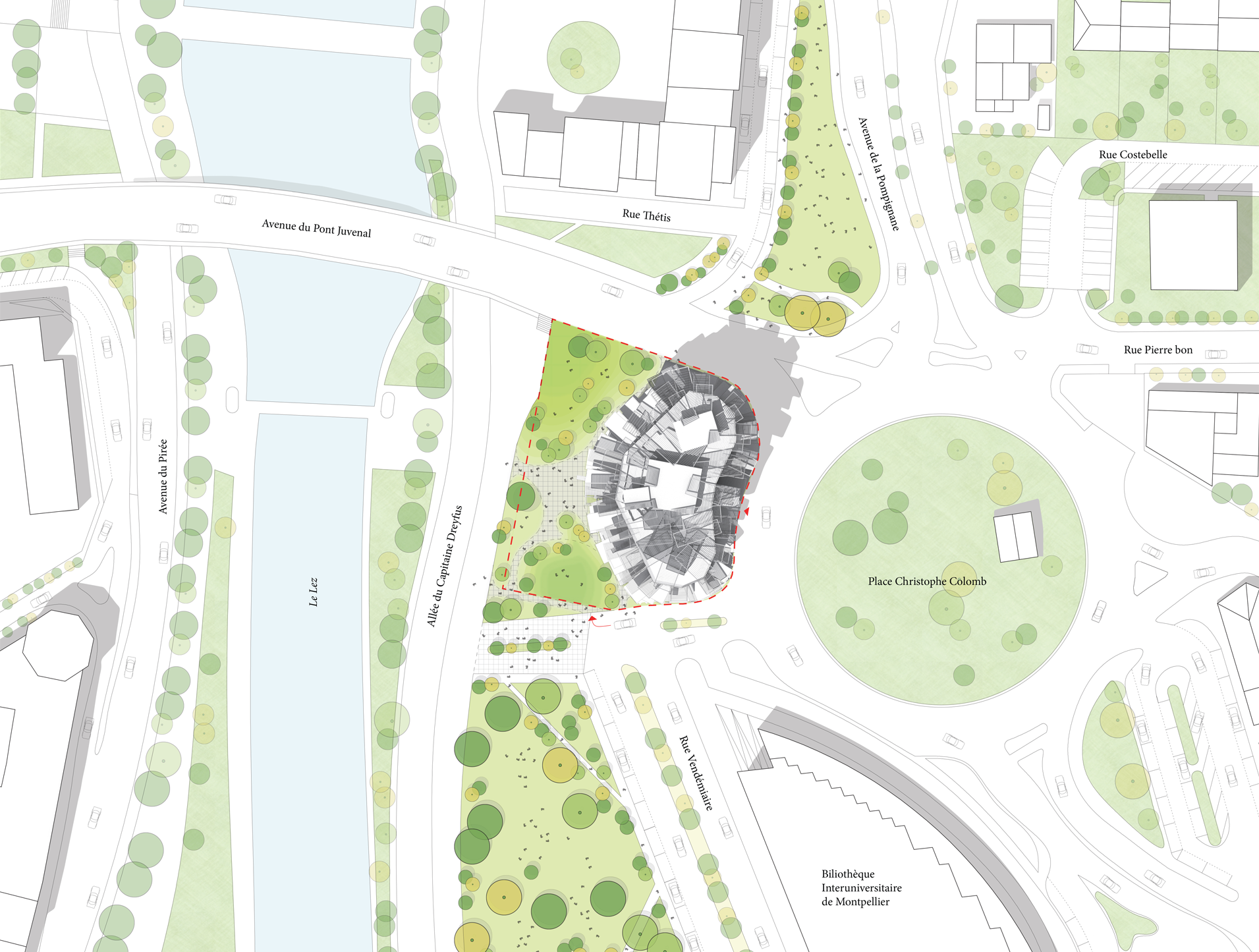 La tour occupe une position stratégique pour la ville de Montpellier, entre le centre-ville et les quartiers récents de Port Marianne et d’Odysseum, à mi-chemin entre le « vieux » et le nouveau Montpellier.