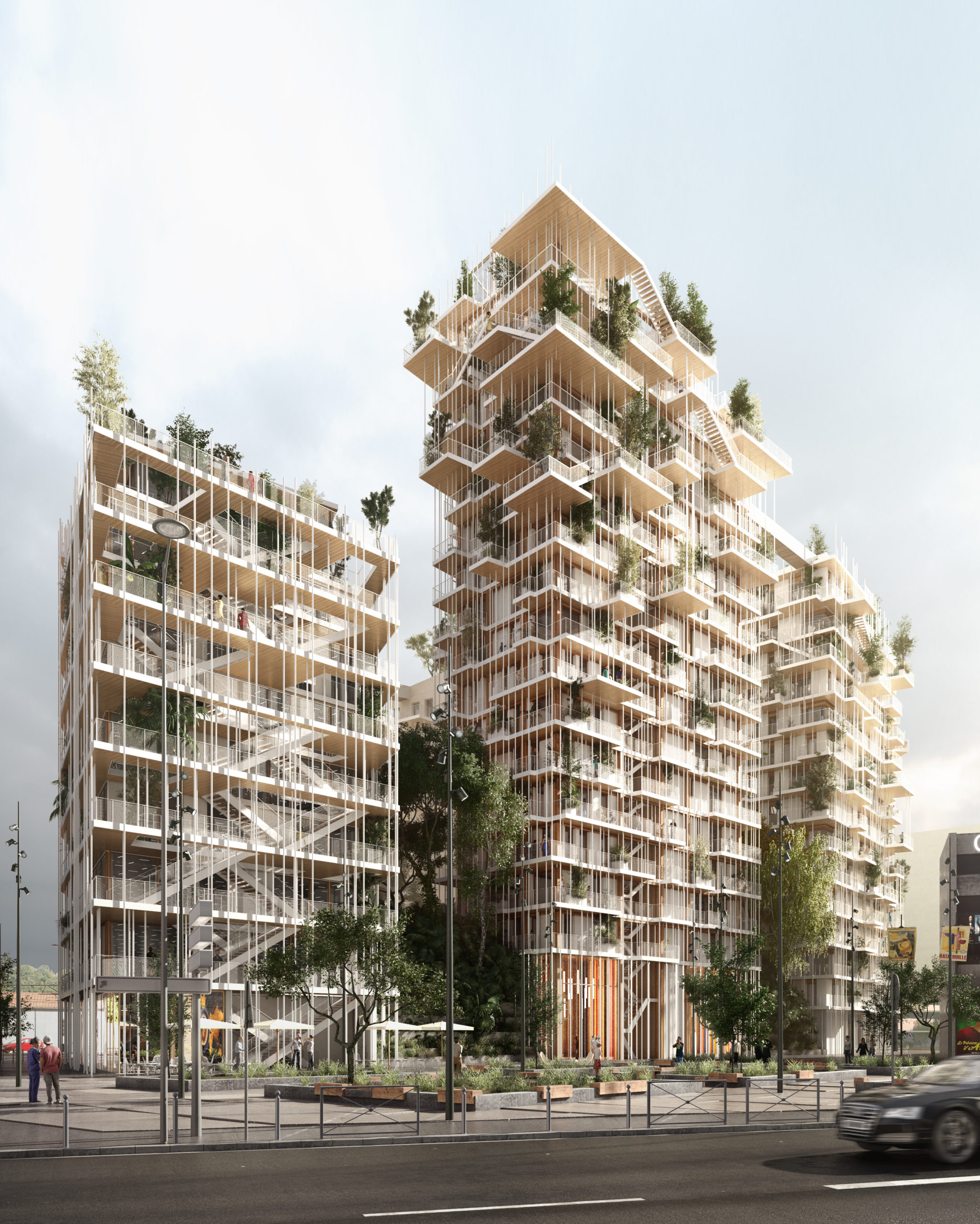 Le projet Canopia situé à l’entrée du nouveau quartier de la gare Saint-Jean à Bordeaux est constitué de quatre bâtiments collectifs et de commerces en rez-de-chaussée qui forment un îlot. Les édifices sont conçus en structure primaire bois.