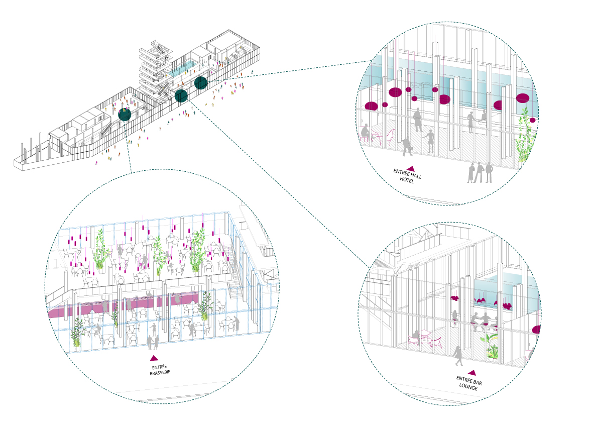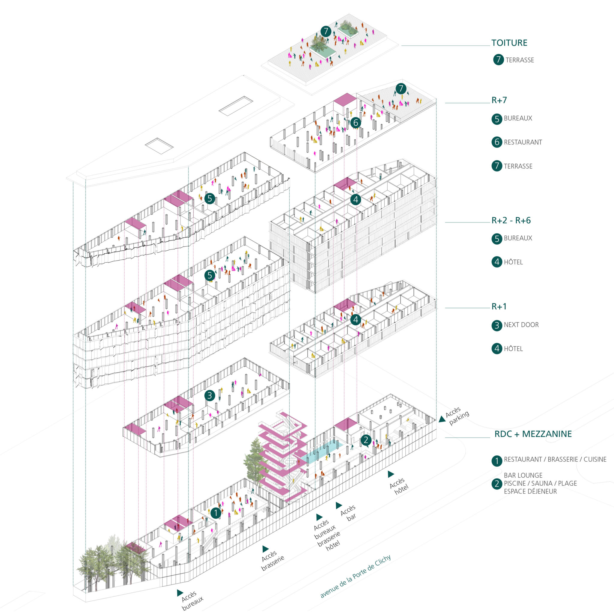 Le projet est constitué d’un complexe d’affaires en structure bois, dont la programmation originale regroupera en un lieu unique des services haut-de-gamme. Un hôtel de 90 chambres offrira quant à lui les services et prestations d’un niveau 4 étoiles à un très large public. Ce projet a pour ambition de répondre aux besoins générés par le tribunal de grande instance qui lui fera face et du reste des quartiers de Paris et de Clichy en pleine mutation.
