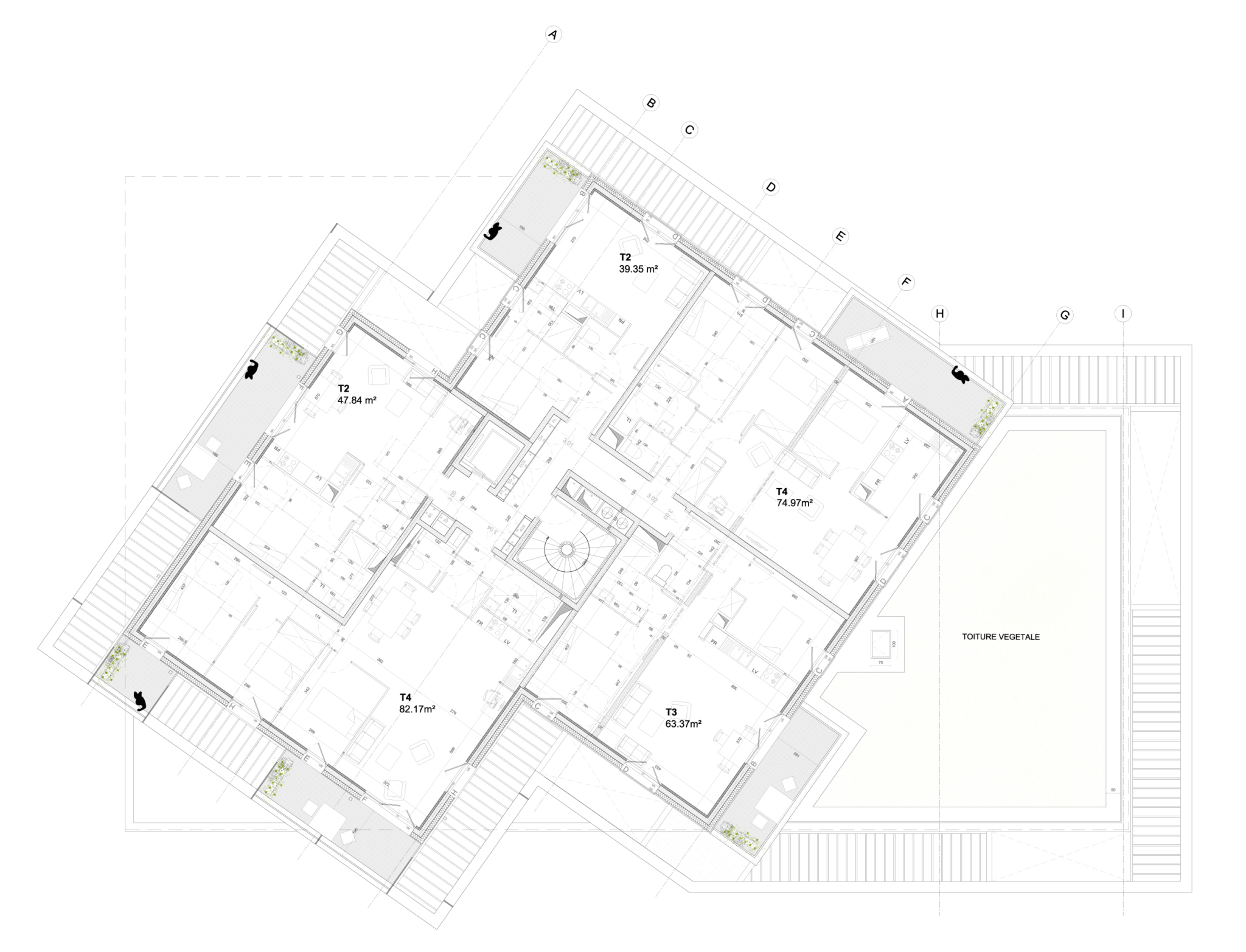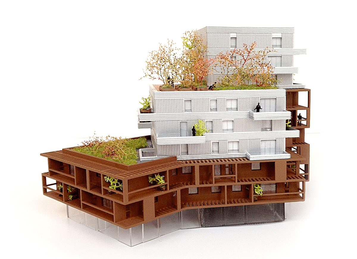 Cet ilot se situe sur la ZAC Presqu'île au coeur de l'agglomération grenobloise. Il comprend un bâtiment constitué de trois parties horizontales distinctes. Le rez-de-chaussée est totalement ouvert sur la rue, il abrite les locaux d'activités et l'entrée du hall de l'immeuble. Ces premiers étages, proches de l'avenue sont bien protégés de l'animation de la rue des martyrs. Une terrasse commune à tout l'immeuble accueillera ses occupants qui pourront profiter de vues lointaines sur les montagnes.