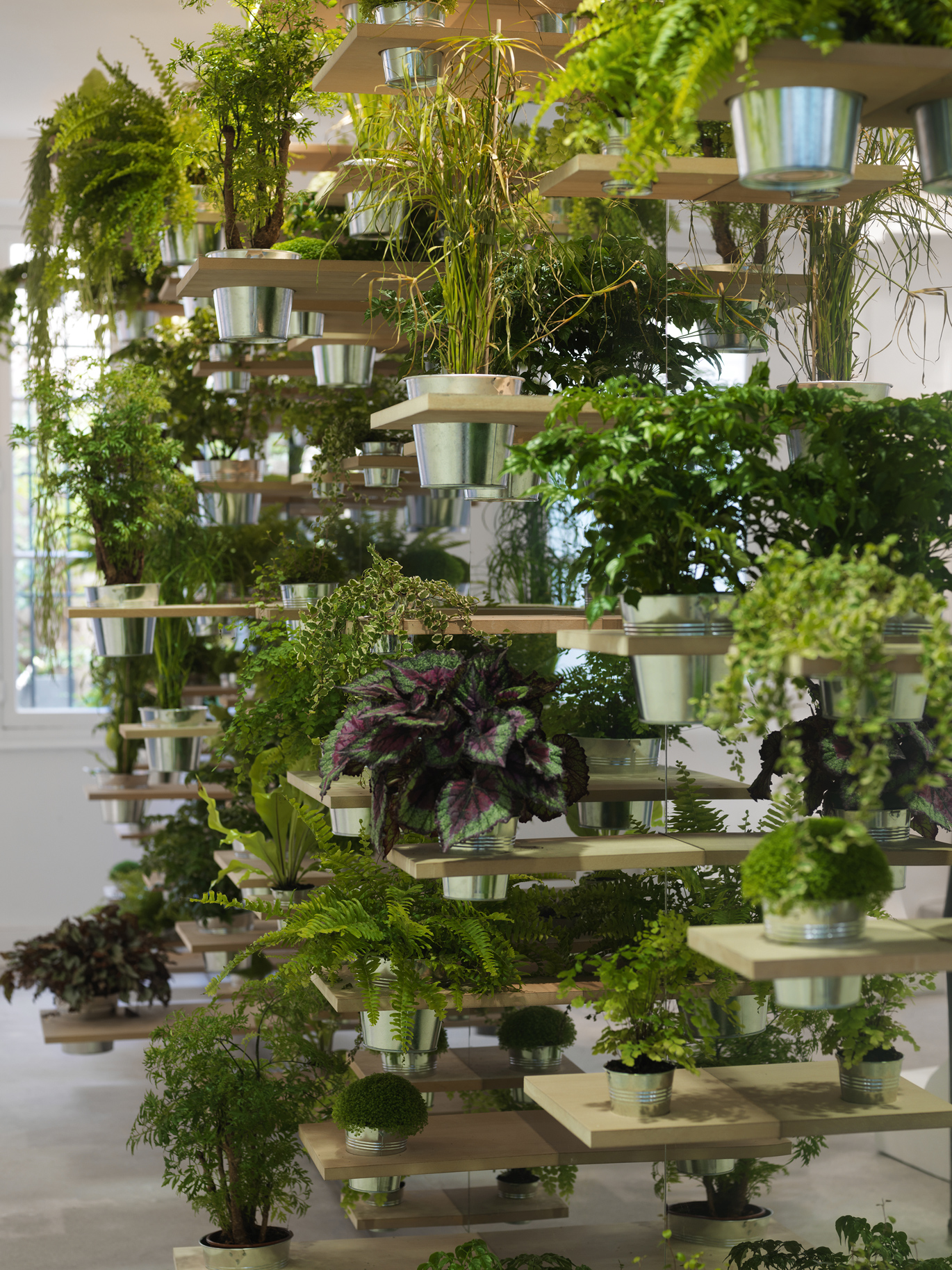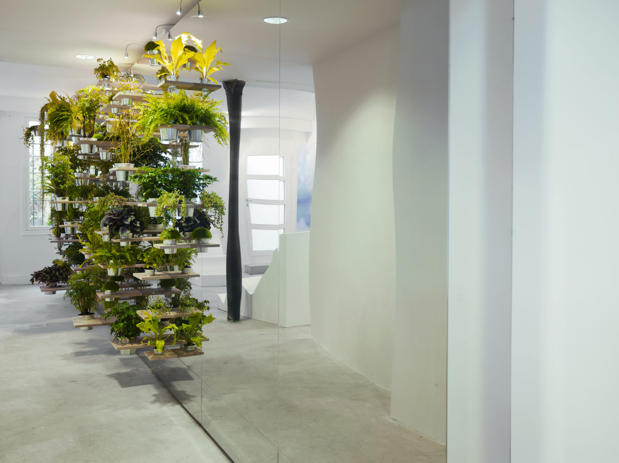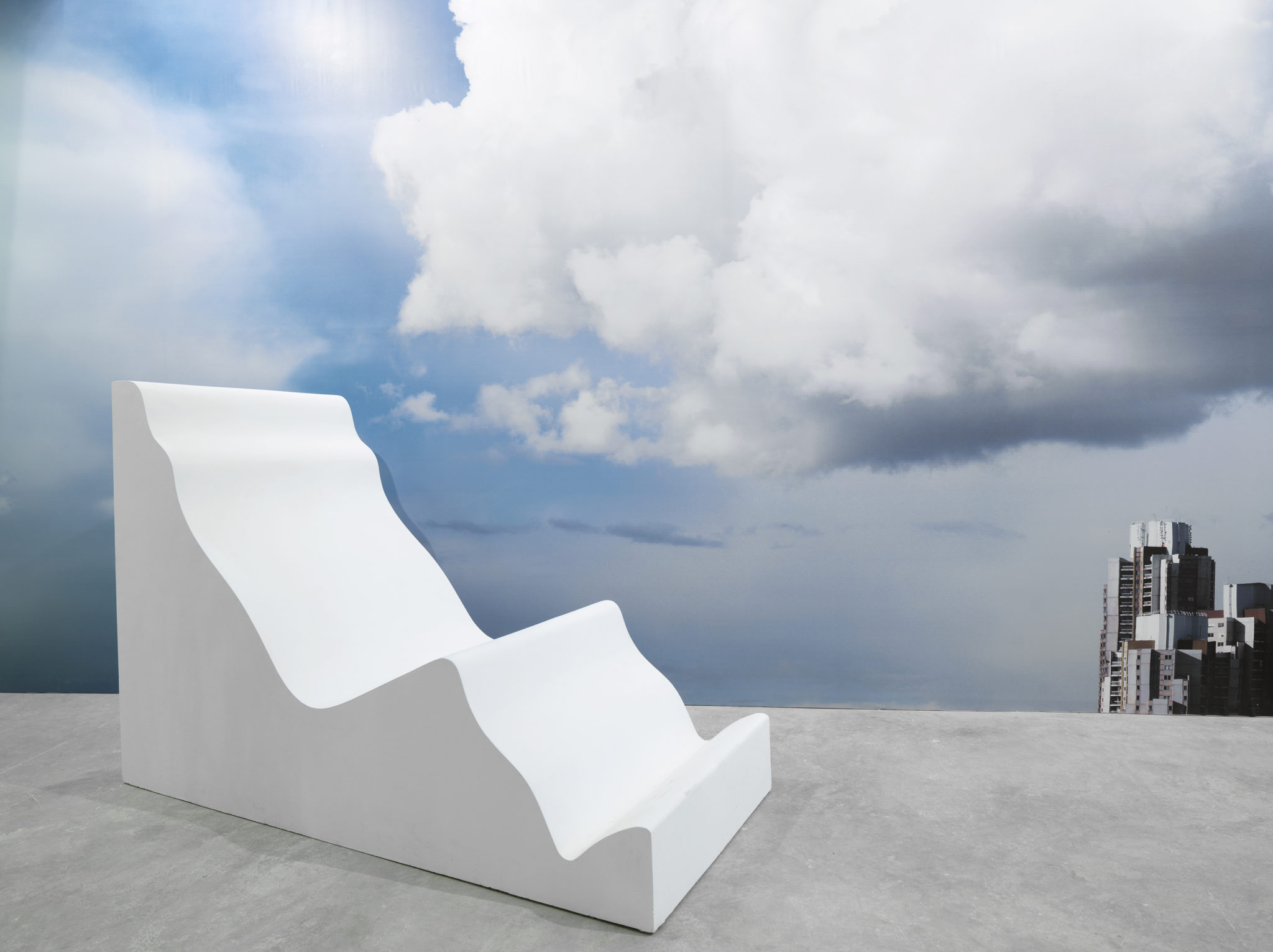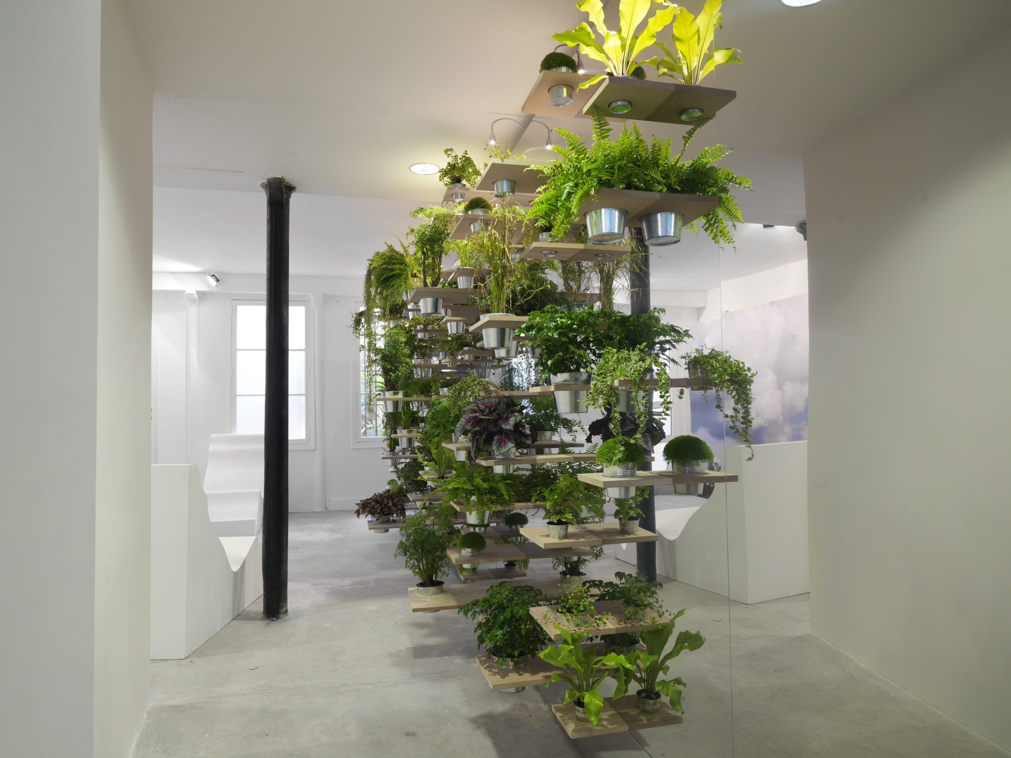 Le bois est le support d’une végétation généreuse et acceuillante. Un mirroir la duplique et la reflète dans les nuages d’une photographie urbaine et deux sculptures aux lignes fluides. Elle semble flotter dans les airs et promet des lieux de vie étonnants entre terre et ciel.