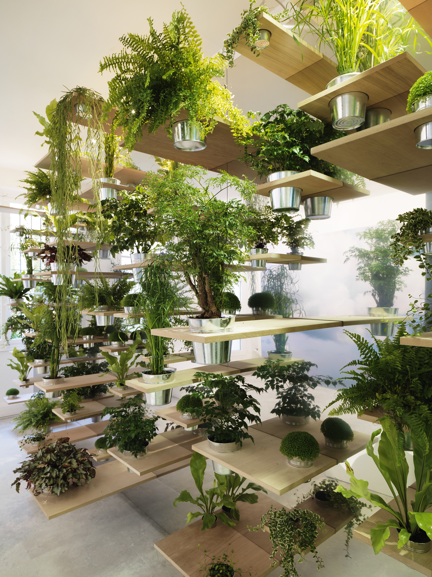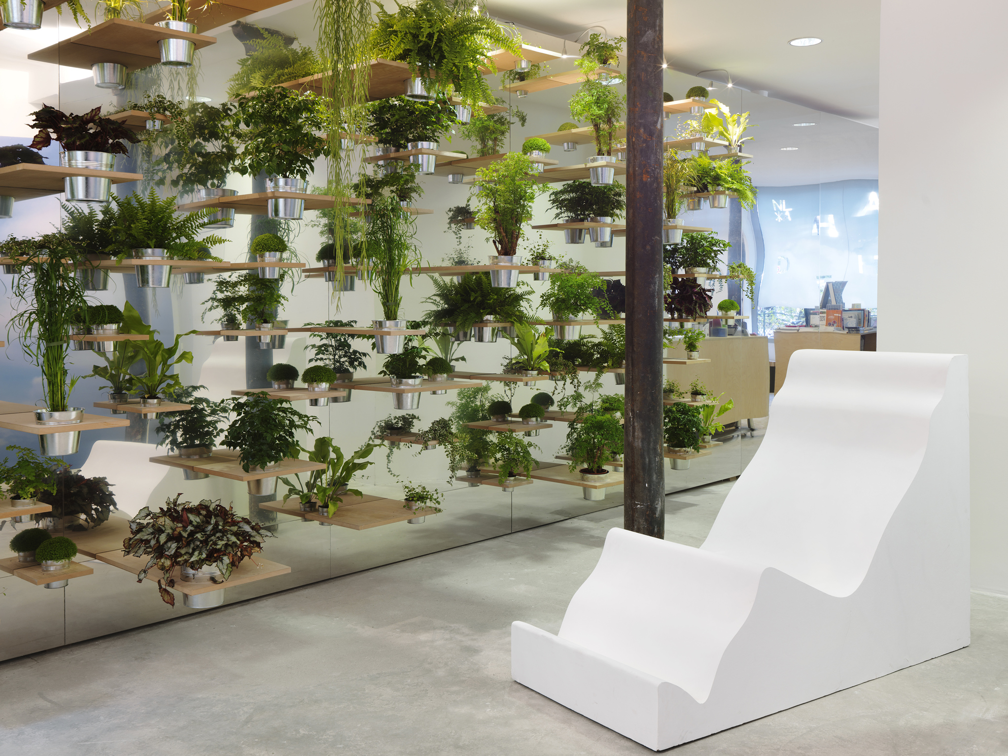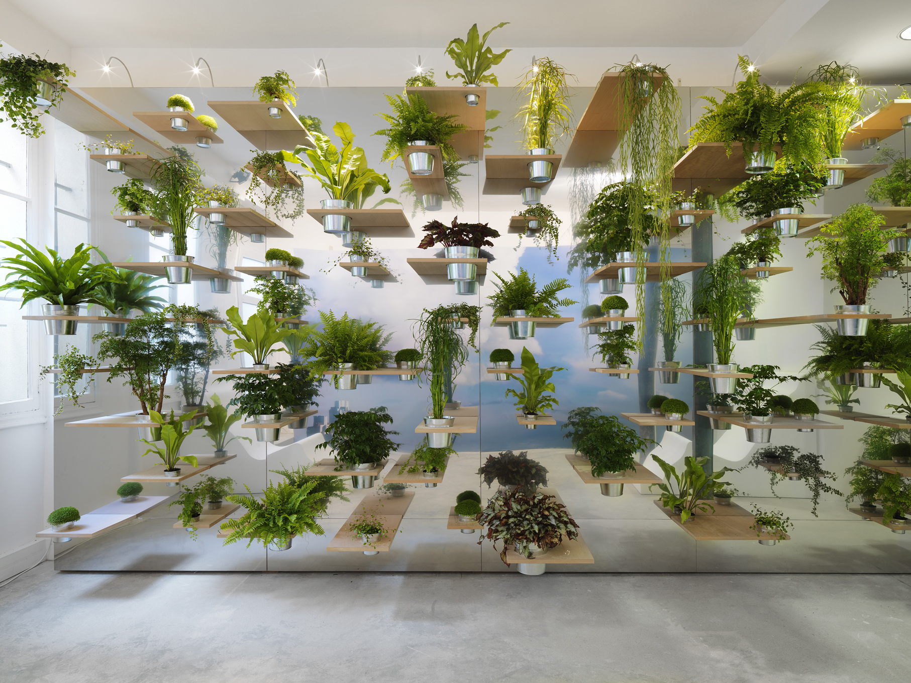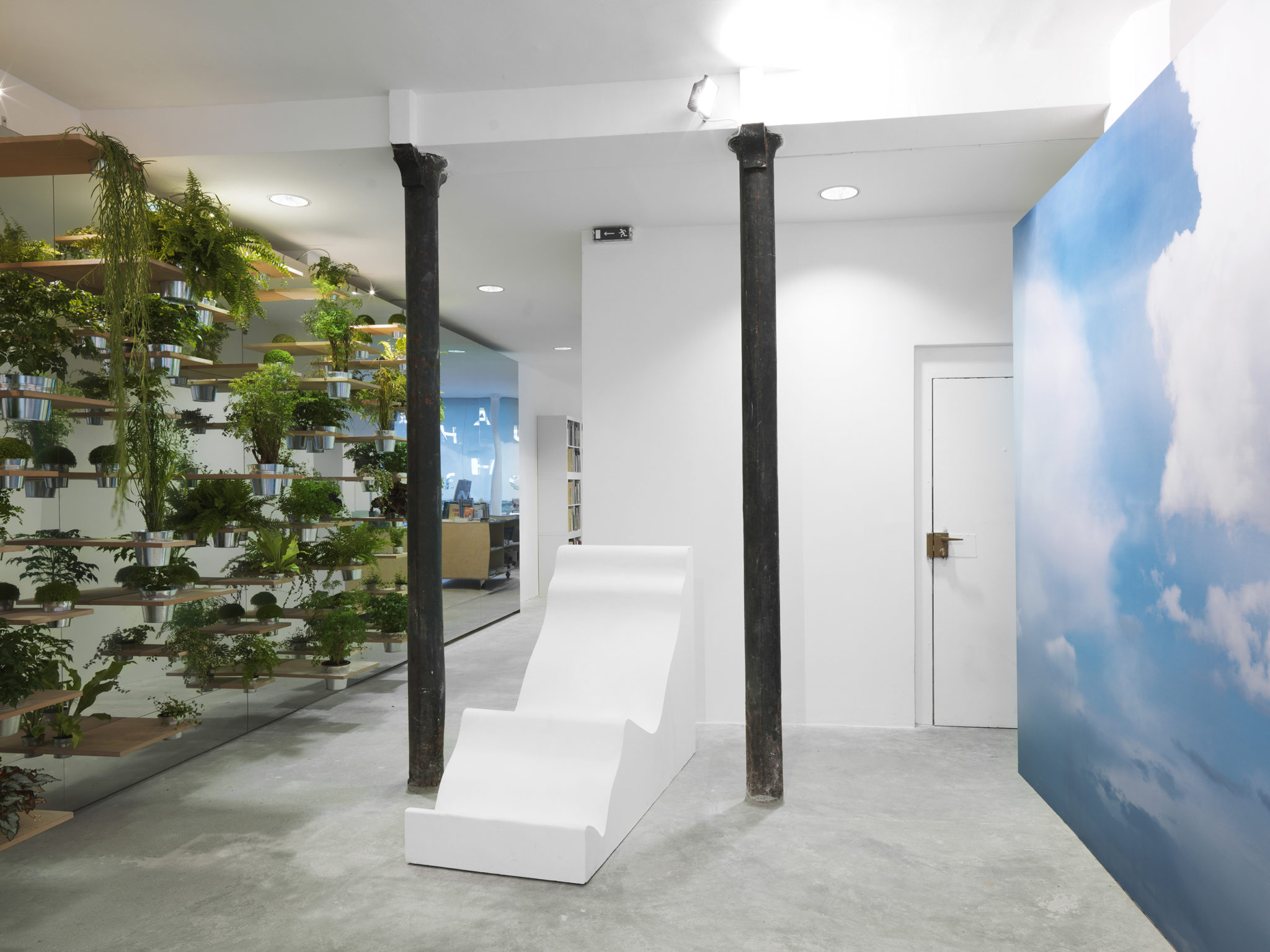 Le bois est le support d’une végétation généreuse et acceuillante. Un mirroir la duplique et la reflète dans les nuages d’une photographie urbaine et deux sculptures aux lignes fluides. Elle semble flotter dans les airs et promet des lieux de vie étonnants entre terre et ciel.
