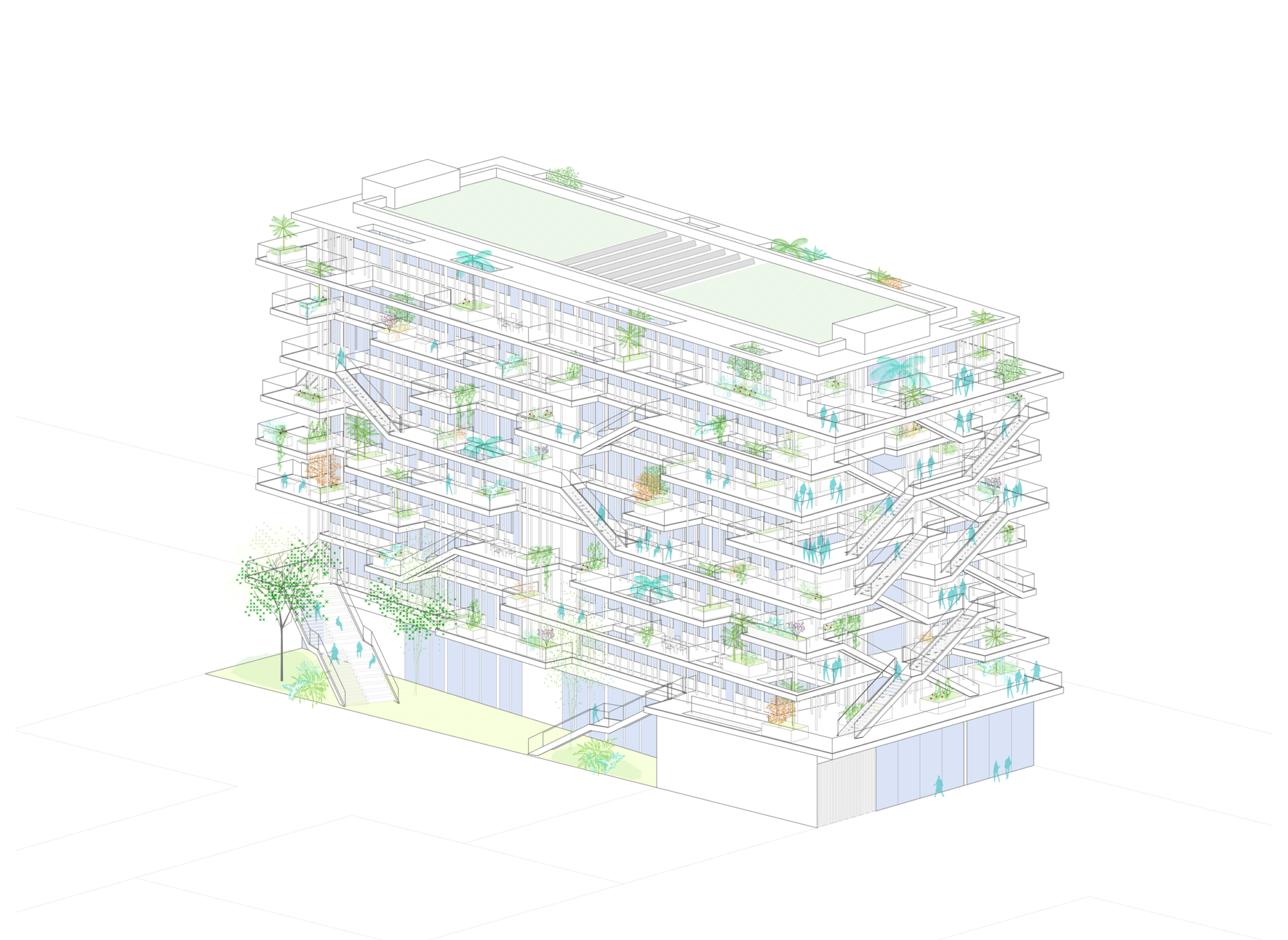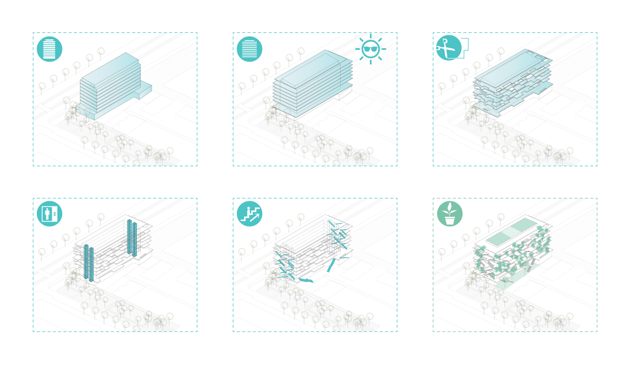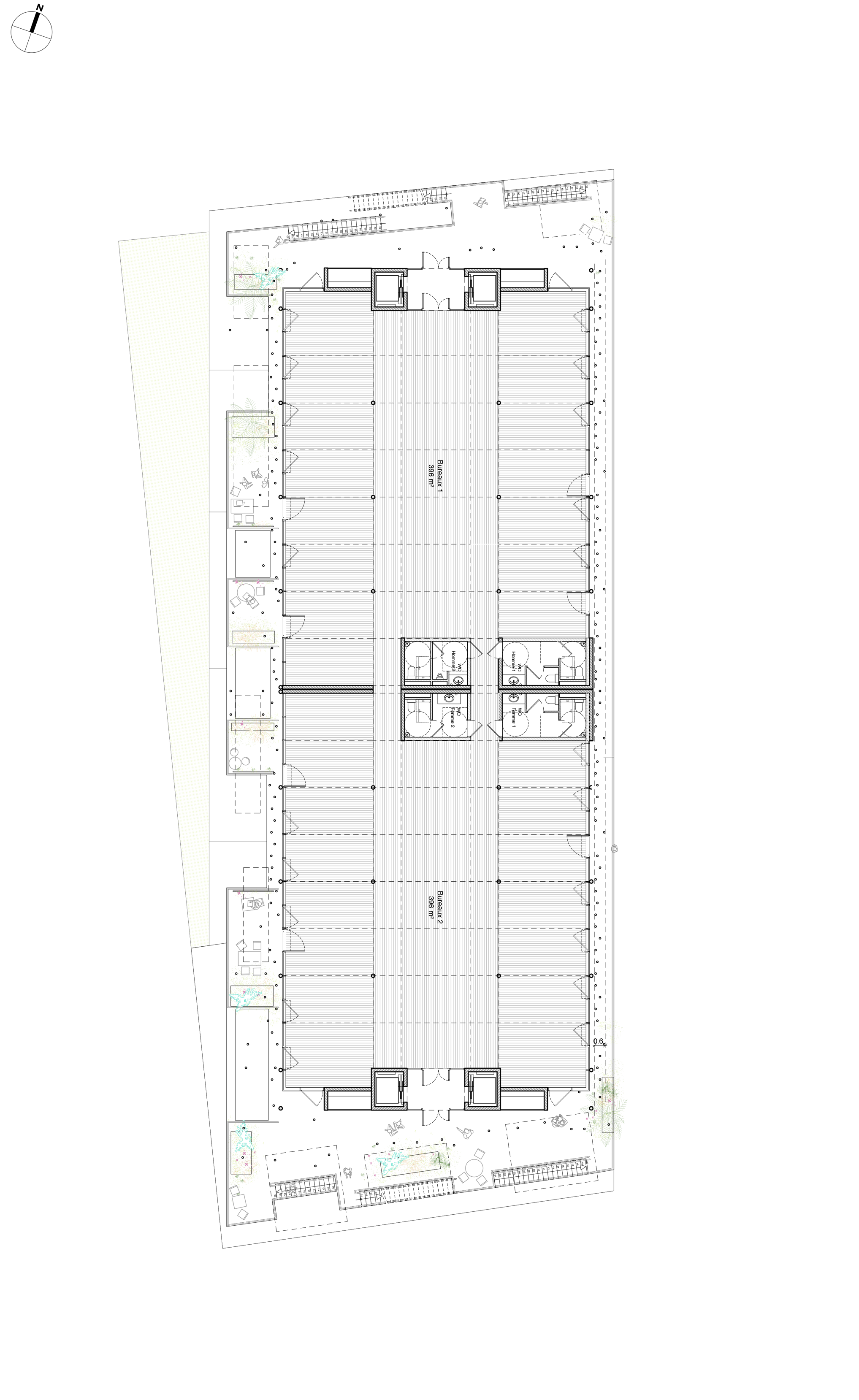 L’organisation traditionnelle d’un immeuble de bureaux est ici inversée. Les circulations habituellement disposées au coeur du bâtiment viennent animer les façades avec une ouverture totale sur l’espace public. Le bâtiment s’ouvre ainsi totalement sur son environnement.
