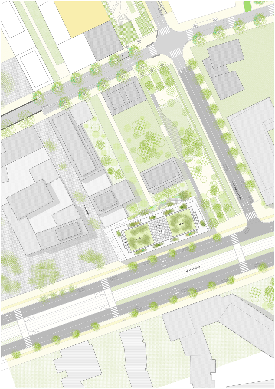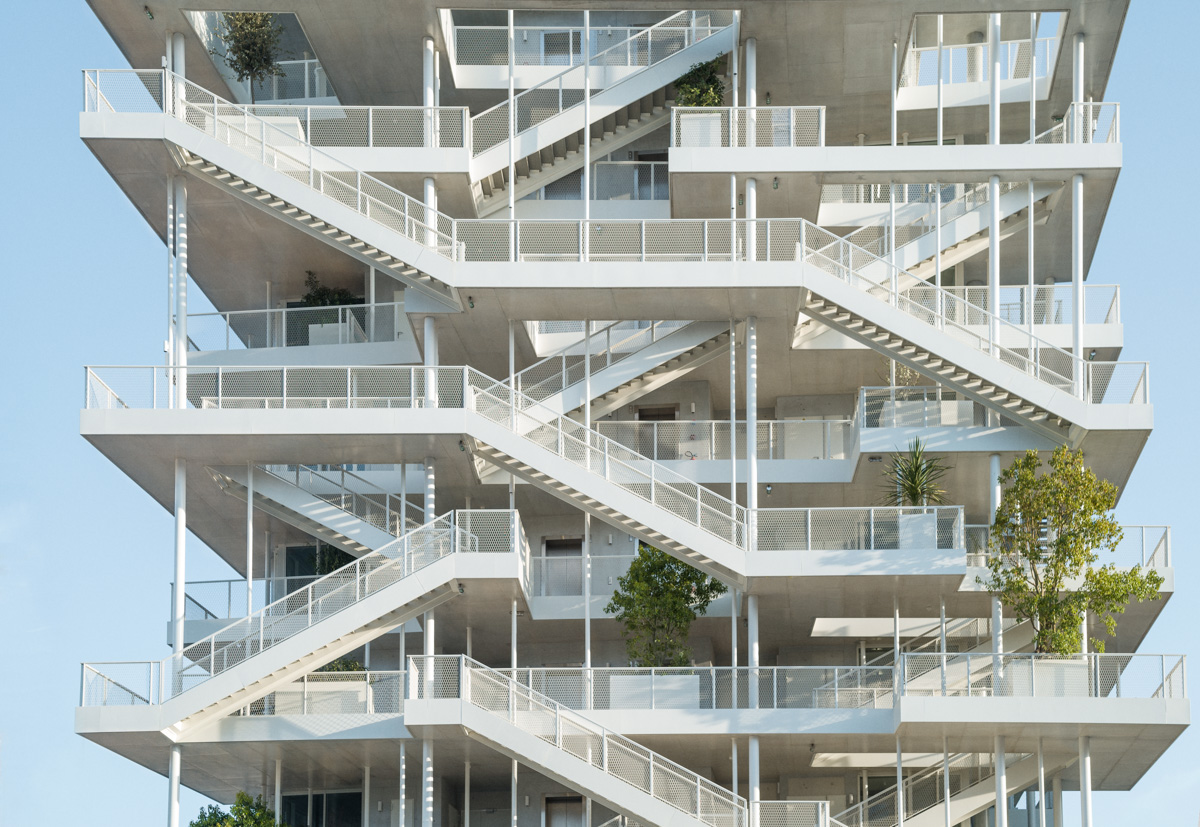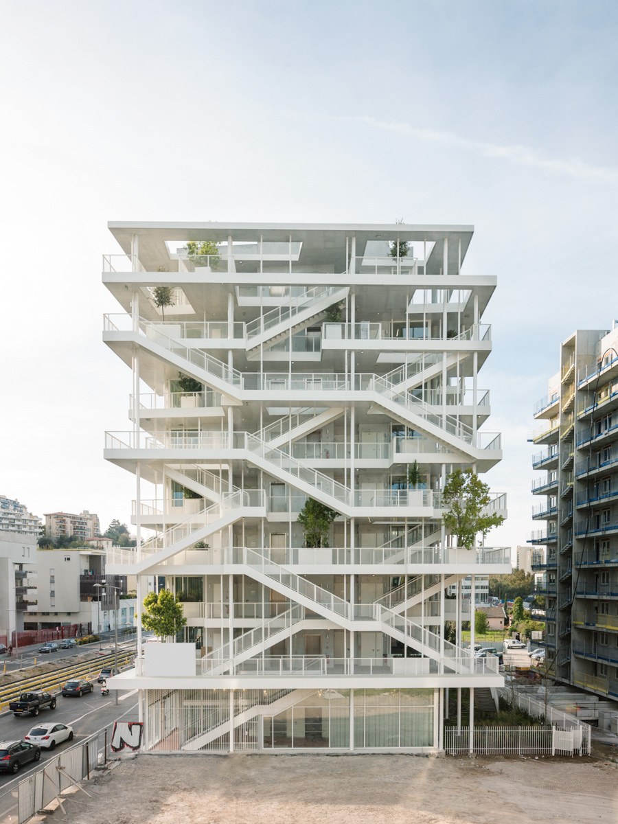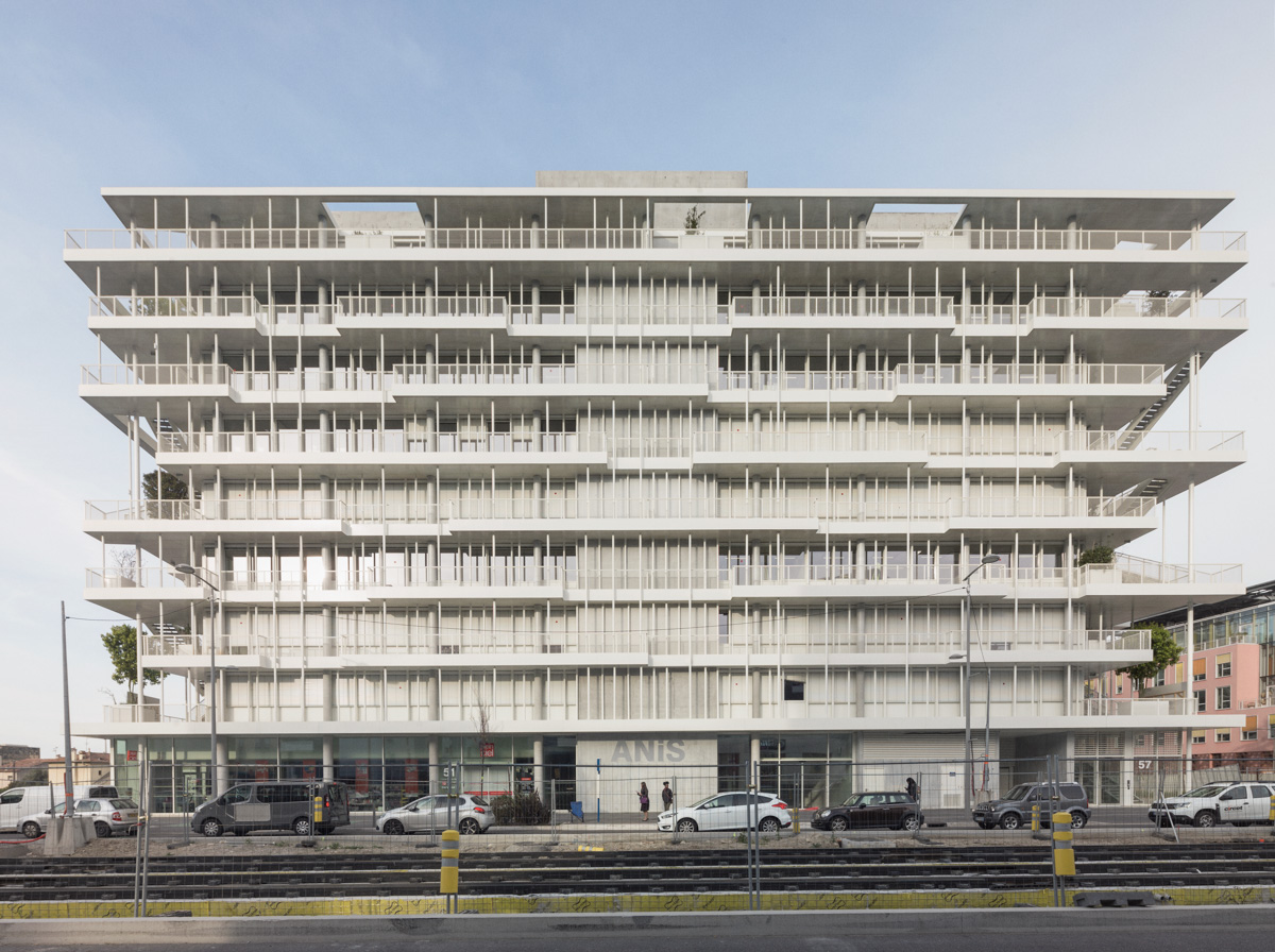 L’organisation traditionnelle d’un immeuble de bureaux est ici inversée. Les circulations habituellement disposées au coeur du bâtiment viennent animer les façades avec une ouverture totale sur l’espace public. Le bâtiment s’ouvre ainsi totalement sur son environnement.