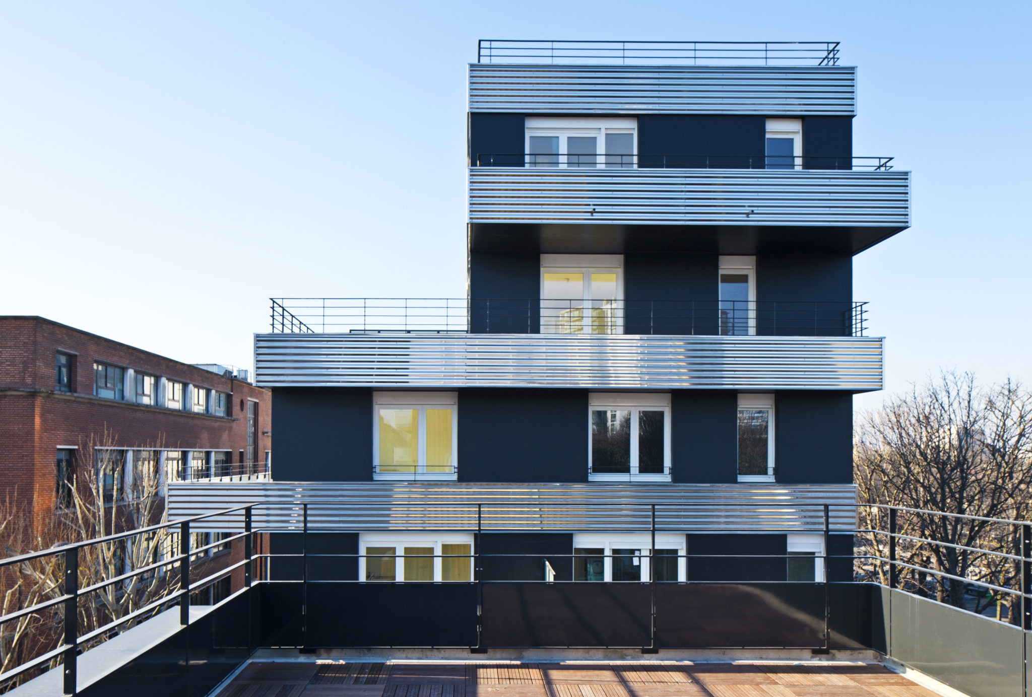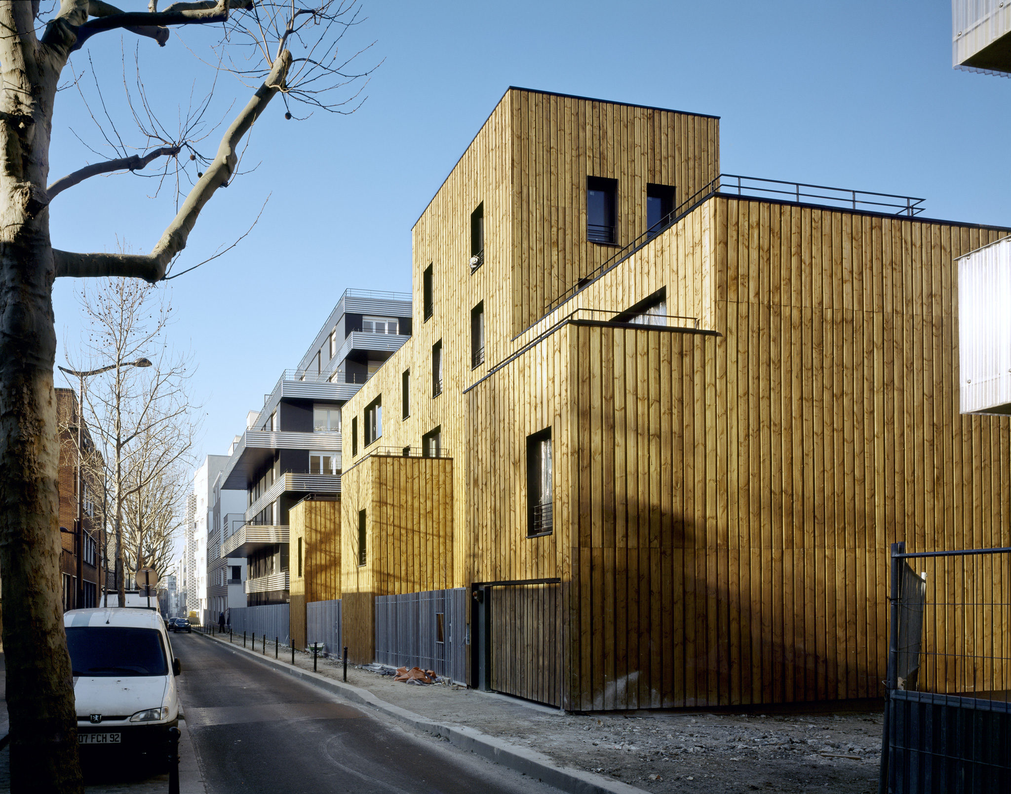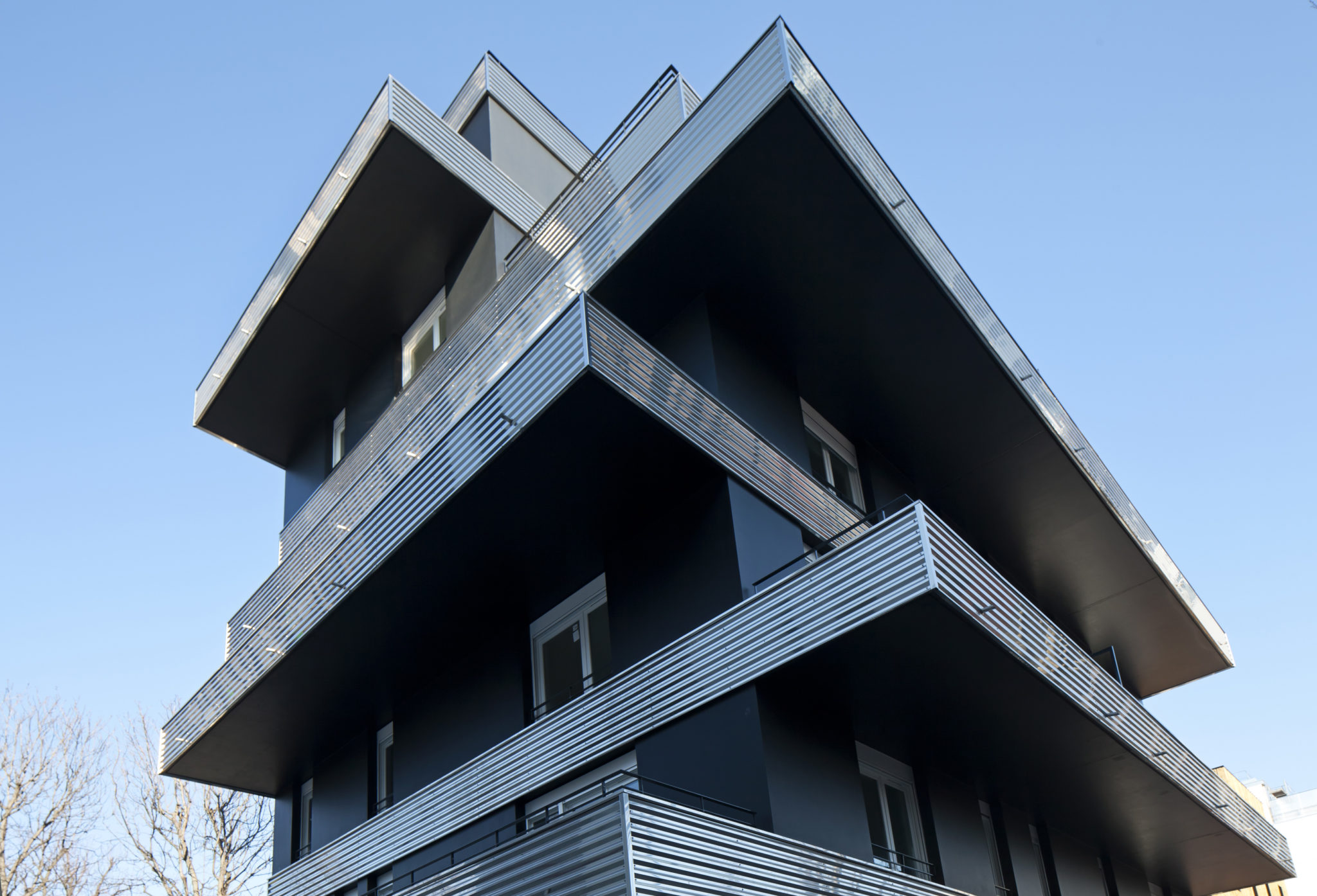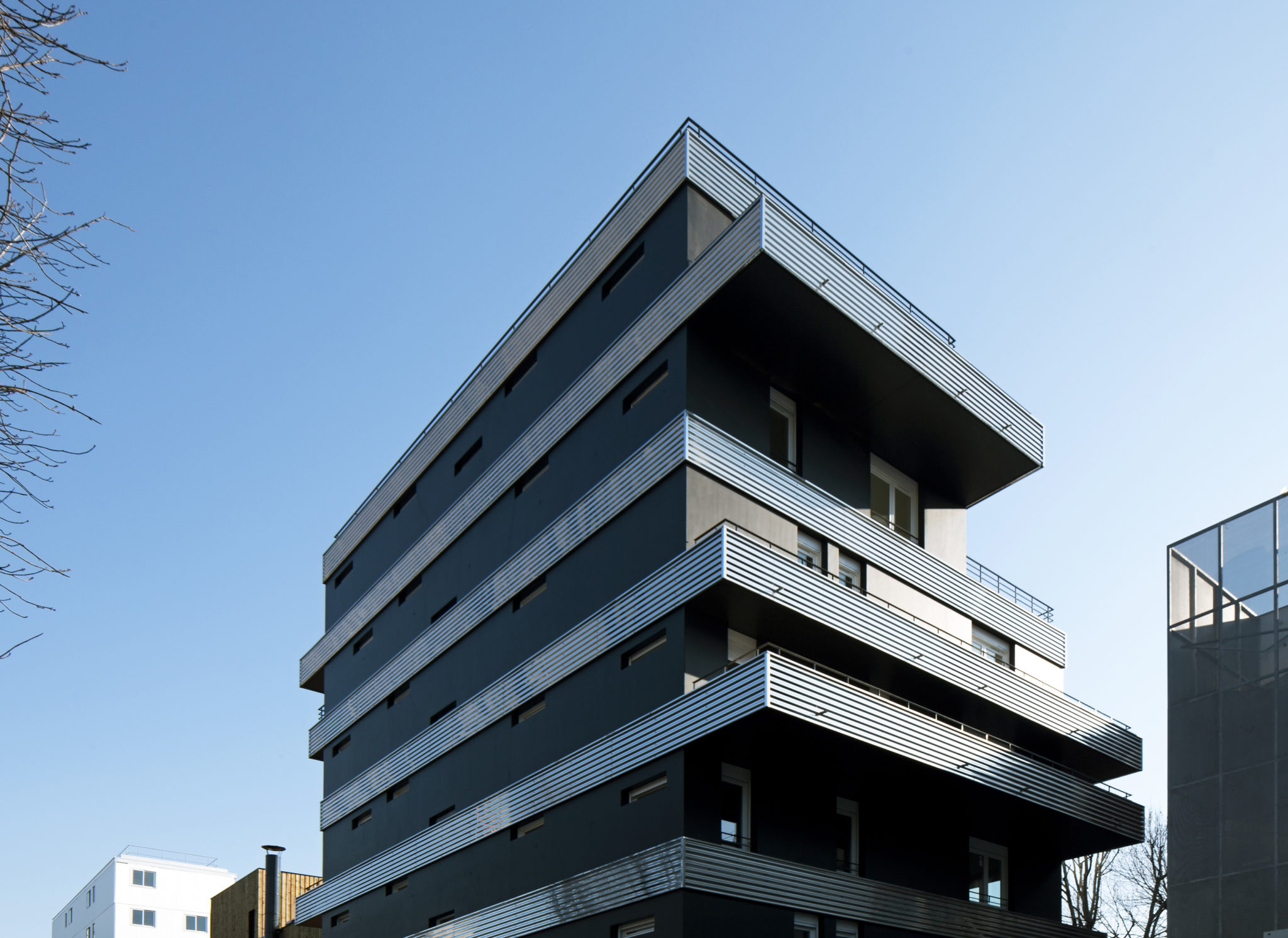 Le premier, dont les façades sont couvertes de béton noir et d’inox abrite des appartements à triple orientation. La structure et le bardage du second sont en bois, elles abritent des appartements duplex qui sont disposés comme des maisons imbriquées. Chacun des logements de ces deux immeubles sont prolongés par des espaces extérieurs qui se décalent d’un étage à l’autre permettant à chacun d’avoir la sensation d’habiter au « dernier étage à tous les étages ».