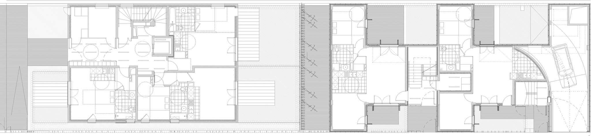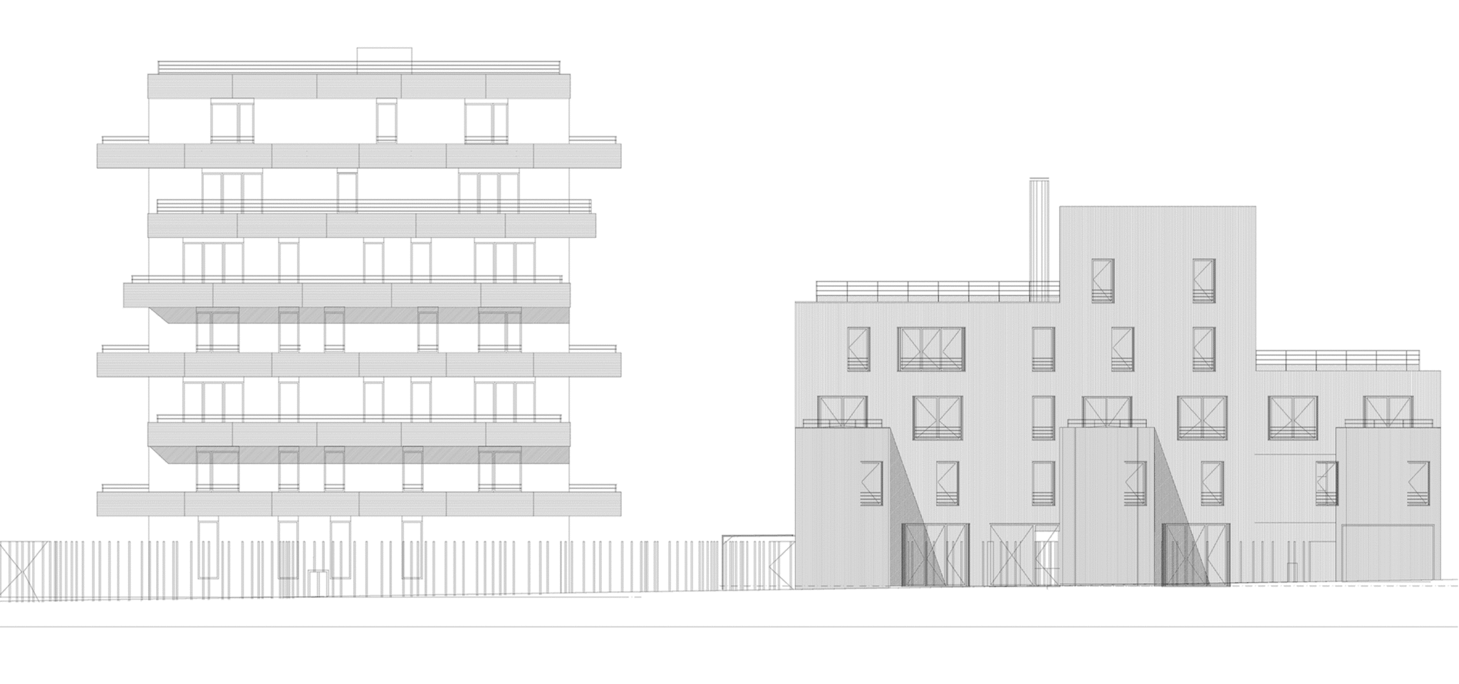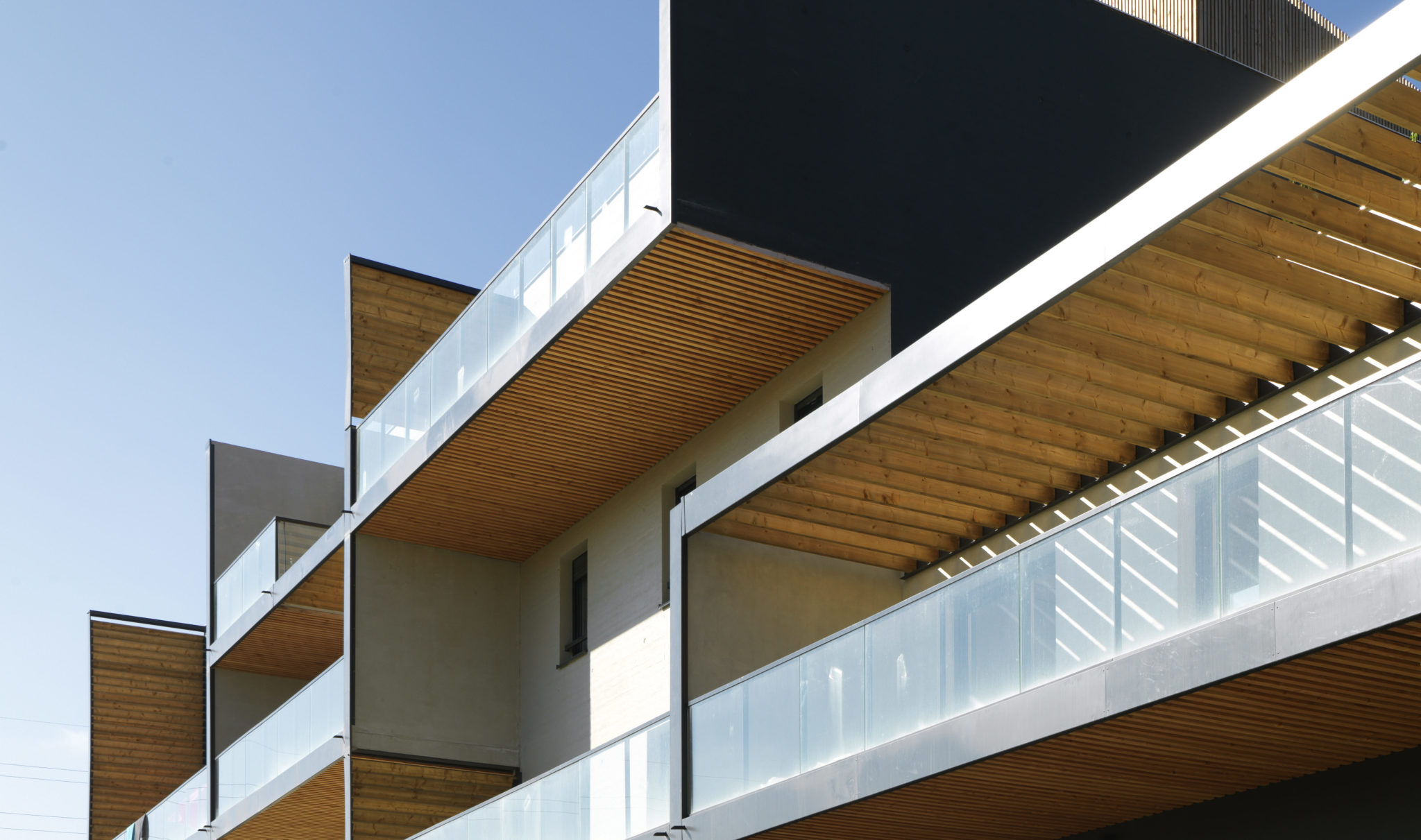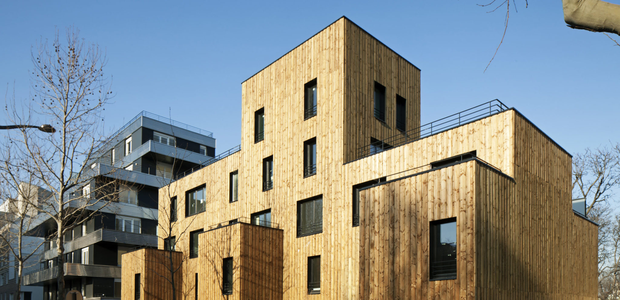 Le premier, dont les façades sont couvertes de béton noir et d’inox abrite des appartements à triple orientation. La structure et le bardage du second sont en bois, elles abritent des appartements duplex qui sont disposés comme des maisons imbriquées. Chacun des logements de ces deux immeubles sont prolongés par des espaces extérieurs qui se décalent d’un étage à l’autre permettant à chacun d’avoir la sensation d’habiter au « dernier étage à tous les étages ».